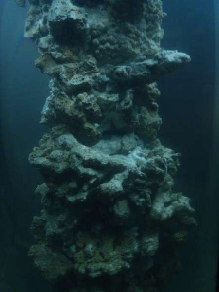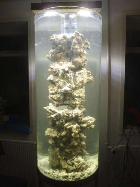 Jeg lavede søjlen ved at tage et Ø90mm PVC rør, som passer perfekt på det indvendige akrylrør, og så har jeg købt levende sten i Dansk Saltvandsudstyr, som jeg har klæbet fast med PU-skum.