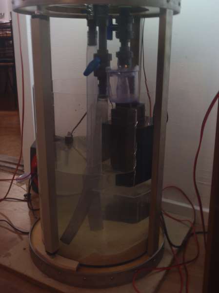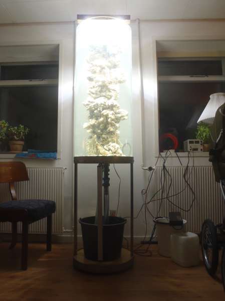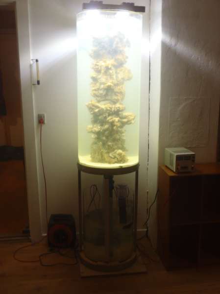 Selve akvariet er akrylrøret, som jeg har fjernet ridser på og poleret op. Det står på et stativ/bord i rustfrit stål, og nedenunder skal der være en sump, også i et akrylrør, dette er dog købt fra nyt i Tyskland. Inde i røret er der et Ø80mm akrylrør, som har både hovedafløb og sikkerhedsafløb med durso, samt en lille aftabningshane så jeg kan tømme det helt, samt tappe vand ved vandskift og til akklimatisering af nye fisk mv. Der er også et 16mm PVC-rør til at trække ledninger fra sump til top. Indløbet kommer op gennem bunden, med en blød Ø25mm pvc-bøjning, som giver cirkulationen. Udenpå det indvendige akrylrør har jeg lavet en søjle af LS sat fast på et Ø90mm PVC-rør med PU-skum.