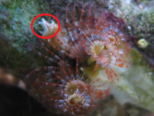 Rørorme har en kalkprop som den lukker hullet i sit rør med. Her lader det så blot til at der vokser et lille mosdyr oven på proppen.