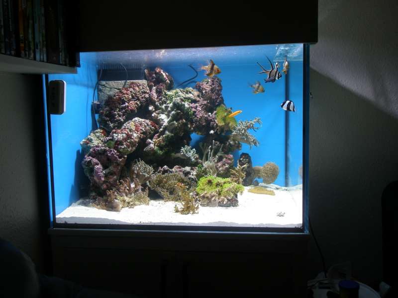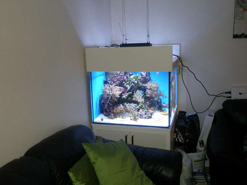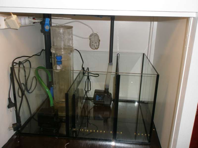 Så kom akvariet hjem: Der blev straks malet blå baggrund og sat pvc-rør i overløbet. Derefter blev der limet en btn slimline på overløbet for at dække det: Så kom sumpen hjem, som er på 91 liter: Så blev der trukket pvc i sumpen og dernæst sat returpumpe og skummer i Dertil var det bare at fylde sand i og flytte alt indholdet fra mit "gamle" 260 liters over i det nye..