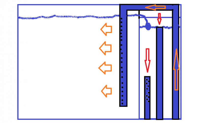 Som Jesper siger skal hovedrøret være under vandoverfladen og langt nok nede til at undgå at kunne suge luft med ned... (Mit akvarie er ca 45cm til overfladen men mit hovedrør er kun ca. 20cm fra bunden og op i overløbet od de øverste 10cm er boret fuld af huller på 4-6mm for at undgå at det kan blive stoppet til af snegle o.lign)