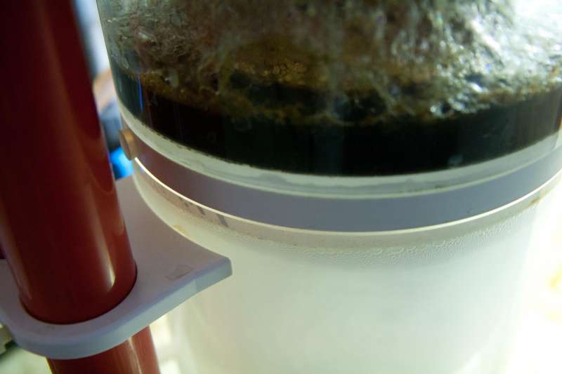2 : Linien i skummeren, hvor der står waterlevel : Hvis jeg justerer skummeren så vandet kun lige står dertiil, dvs ca 1½-2 cm UNDER der hvor skummerrøret/indsnævringen begynder, så laver den ikke meget skum.