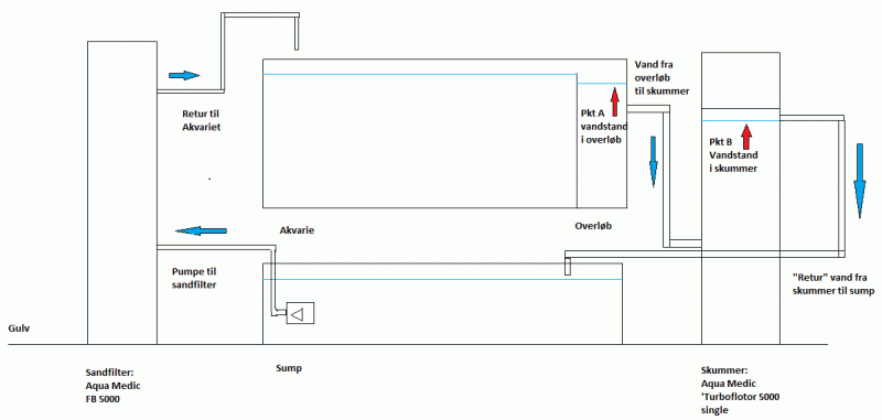 Hvad skal højde mellem de to vandhøjder (pkt A og B) være for at vandet kan løbe "frit" og ikke bare stige i overløbskassen i akvariet?
