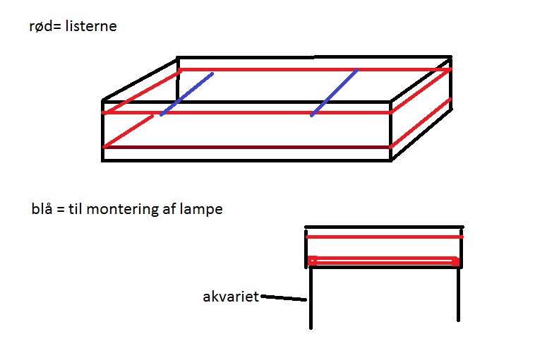Jeg har siddet og prøvet at forestille mig at lave en lampeskjuler, men kan simpelthen ikke komme på et smart design? Jeg skal jo kunne åbne den rimelig nemt, da jeg skal kunne fodre hver dag mv. Desuden skal den kunne bære to LED-lamper, så den skal have en højde på omkring de 30 cm, så disse kan komme højt nok, til at hele akvariet bliver dækket med lys, men må stadig ikke være for tung.