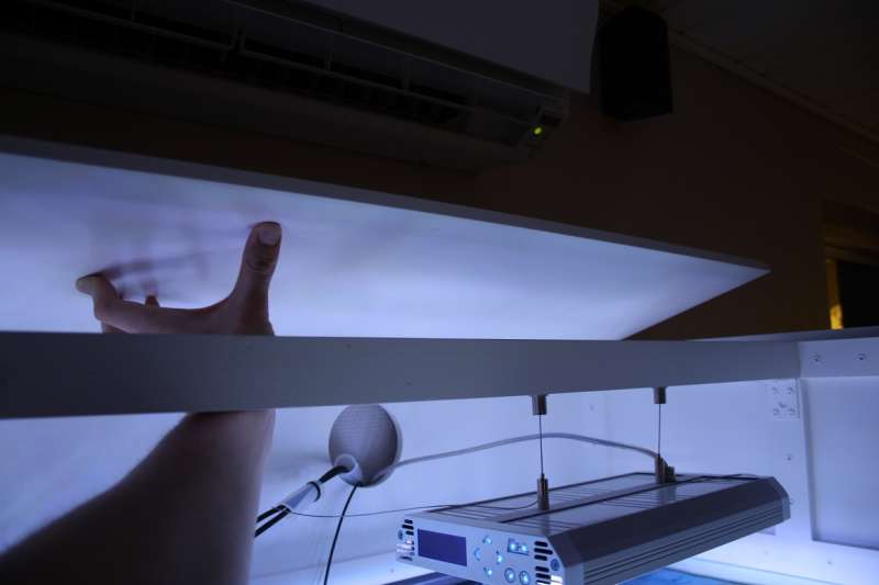 Min lampekasse er lavet som lakeret MDF på porsa. Porsa vejer jo stort set intet. Lampekassen er i 3 dele. Forpladen og den forreste del af toppladen sidder sammen som del 1. Del 2 er så den bageste 2/3 af toppladen. Del 3 er så resten. Mit akvarie er kun 93 cm langt, men det er kun lige jeg kan sætte del 3 på uden hjælp. Jeg kan selvfølgelig sagtens løfte den op, det er ikke det, men den skal glide helt præcist og helt lige ned over 3 glassider, hvis der ikke i længden skal komme grimme mærker i lakken.