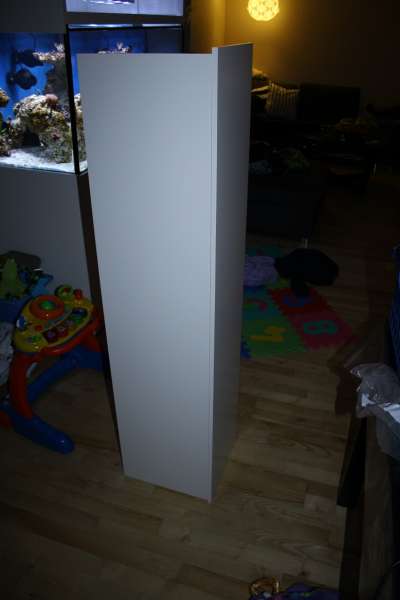 Alt er skruet indefra med skruer, som selvfølgelig ikke går igennem. Det er altså listerne, som er skruet på pladerne, og ikke pladerne der er skruet på listerne(forstår du hvad jeg mener?) - Derfor er der ingen skruehuller udefra. Jeg har så fuget alle revner mv. indvendigt med acryl for at forhindre fugt. Desværre er skruerne som er brugt på listerne synlige, og frygter at de vil ruste med tiden, men så må det være tid til et nyt akvarium