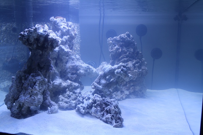 Der er ca 35 kg sten i søjlerne og deter den mængde der kommer i akvariet. på en måde håber jeg at kunne holde en god cirkulation i systemet med de pumper jeg har. jeg overvejer kraftigt at købe baggrundsplader med sten på hos decocean... har set dem flere steder og det ser sgu godt ud.