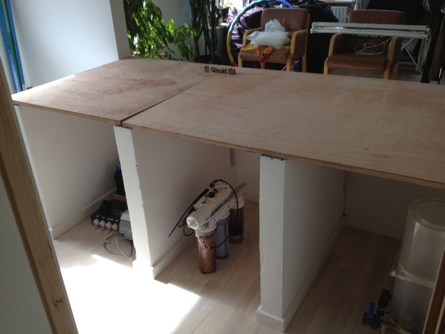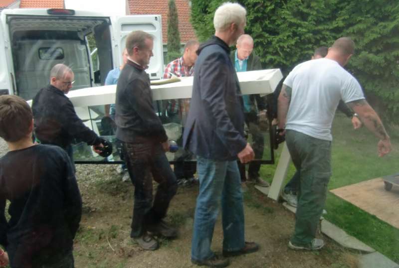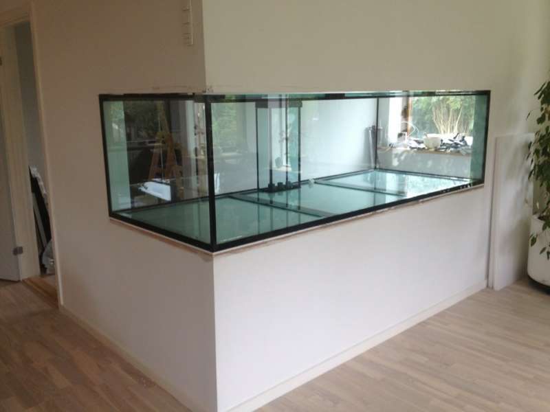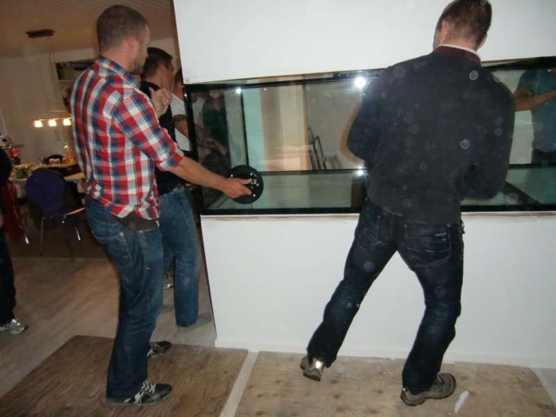 Tillykke med det. Meget imponerende. Jeg bliver nødt til lige at spørge om en ting: Jeg ville også helst have haft et indbygget akvarium, og overvejede på et tidspunkt en hjørneløsning. Jeg opgav dog ret hurtigt ideen da jeg ikke lige kunne se hvordan jeg skulle få et I-jern til at gå rundt om et hjørne og bære væggen ovenover, uden en støtte i hjørnet. Synes det ser ud til at dine vægge også er i sten / gasbeton, så hvordan har du båret dig ad?