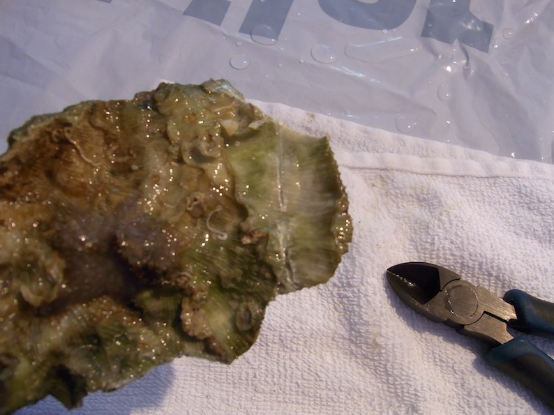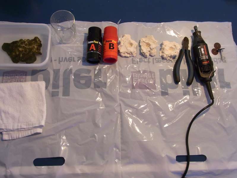 Jeg skær med dremlen på bagsiden af korallen. Jeg har valgt ikke at skære hele vejen igennem for at undgå at smadre det bløde væv alt for meget da snittet bliver enormt varmt. Jeg bruger istedet en lille bidtang til knække stykket af. Det fungerer helt fint.
