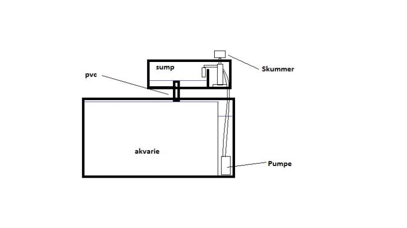 Så jeg har tænkt over om det kunne lade sig gøre at lukke hullerne i overløbet og smide en pumpe i der pumper vandet fra overløbet op i sumpen på skummeren og så lade det rene vand fra skummeren løbe ned igennem et hul i sumpen og ned i akvariet...