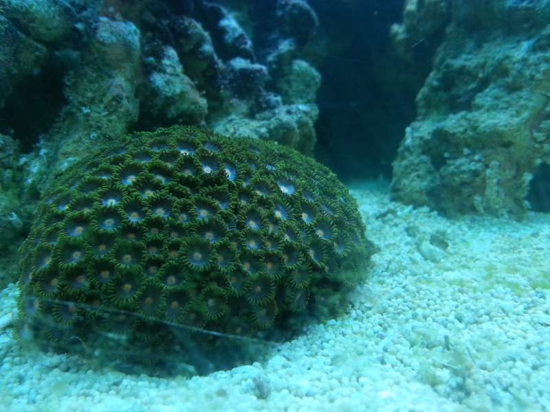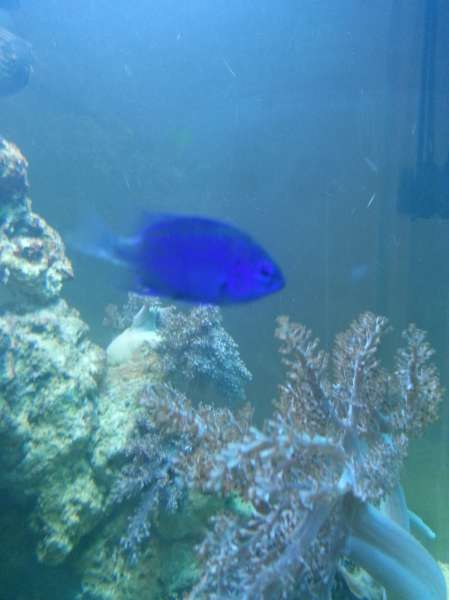 Jeg synes det tager sig fint ud, Det er jo et "nystartet" akvarie;) Fine kenya-træer og Zoa. Umiddelbart er din blå fisk en Damsel af en slags.