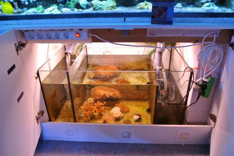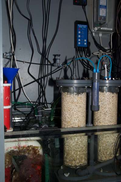 - 2 sump: 300 l - refugium, indeholder pt. bobble-koraller, en tot Xenia som Po4-opsuger og en stor Sacrophyton. Returkammer med osmolator