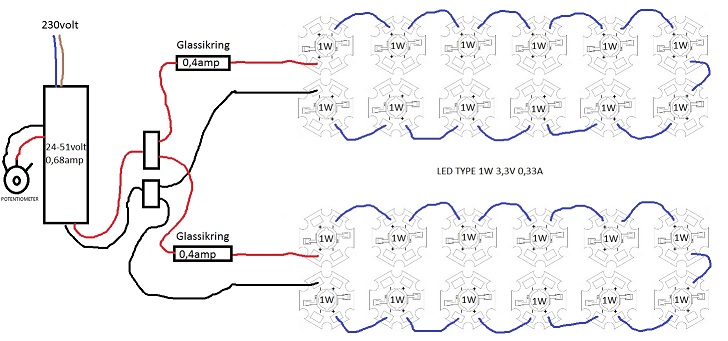Jeg er ved at starte et lille projekt akvarie op hvor jeg vil lave lidt LED lys til, og så har jeg tænkt mig at bruge 1w LED, men så er der lige det der med at parallelforbind LED, og sammentiedig så skal det hele jo ikke brænde af, bare fordi en enkel LED smutter i svinget, så jeg har prøvet et lave en tegning sådan som jeg lige umiddelbart ville lave det, men hvis der er nogen som kan se det er helt forkert, må de da meget gerne lige kommentere det.