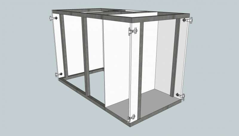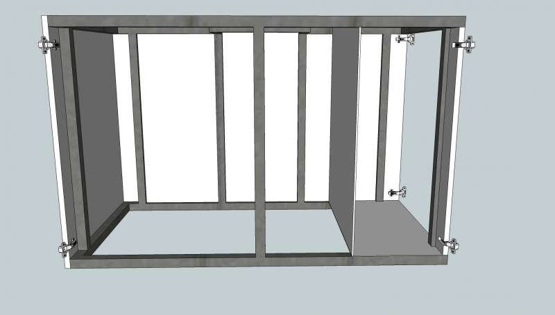 Det skal være med overløb midt på bagvæggen og have et særskilt rum til elektronik og strømskinner. Derfor skal der en låge i den højre side og derfor er det lidt en udfordring at hængsle den højre frontlåge.
