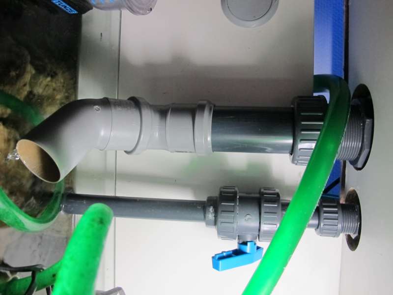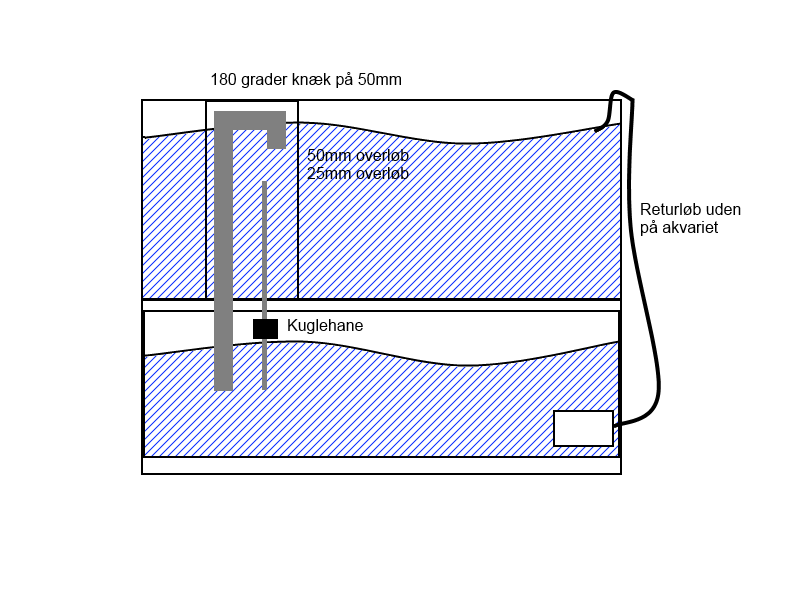 Nu har jeg lavet begge rør i overløbet til nedløb til sumpen og lavet et returløb uden på akvariet.