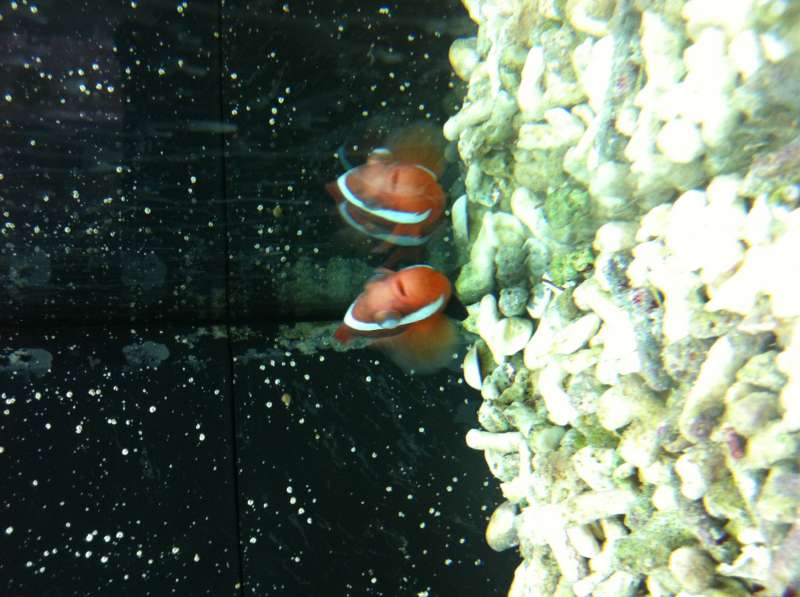 Her er klovefisken. Dens ene øje er helt mat mens det andet ser sådan normalt ud. Selve fisken ser "støvet" ud. Kardinalerne har stadig hvide pletter. Det ligner faktisk tørret saltvand ( saltkrystaller) der sidder på deres kroppe.