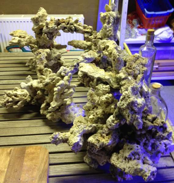 Hjemmelavede søjler af døde indonesiske sten, som er samlet med fliseklæb og PU-lim og bygget op med forholdsvis mange små stykker for at skabe en masse luft, så jeg kunne undgå alt for massive søjler, som giver en dårlig cirkulation, og samler en masse skidt.