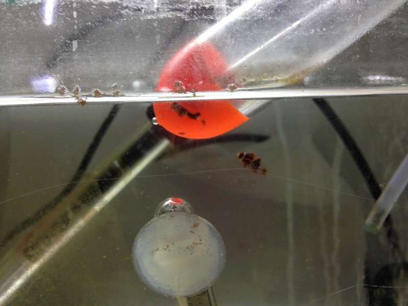 Så er de første unger begyndt at morphe, det kan ses på billedet herunder. Det sjove er at efter den er morphet er den blevet bevidst om at den skal gemme sig så nu kommer den ikke ud fra under temperametret mere :-)