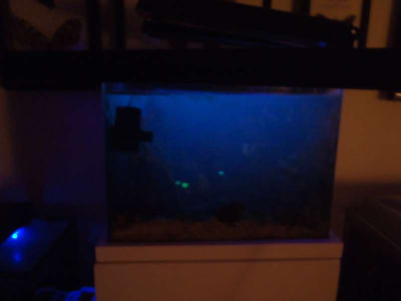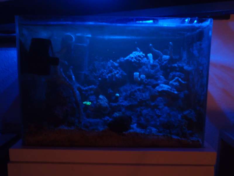 Nr. 1 er med 405nm rør over. Vandet bliver turkist og uigennemsigtigt. Og så glemte jeg at skrive før, at det kun er meget få koraller, der flourscerer i det.