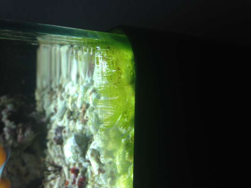 1. Ud fra hvad jeg har kunne læse, så er dette en glasrose? Kan i venligst be/ -afkræfte om det er det? Hvad gør de? Og hvordan fjerner man dem lettest? 2. Er begyndt at få nogle grønne alger, som sidder rigtig godt fast på glasset. Hvorfor kommer de? Og hvordan får man dem lettest væk? Her tænker jeg både med at fjerne dem fra glasset, men også generelt så de ikke dukker op. 3. Min ene koral er pludselig begyndt at få nogle sorte/ grønlige pletter - Hvad er det, og har det nogen betydning? Lige et billed af akvariet som det står til slut