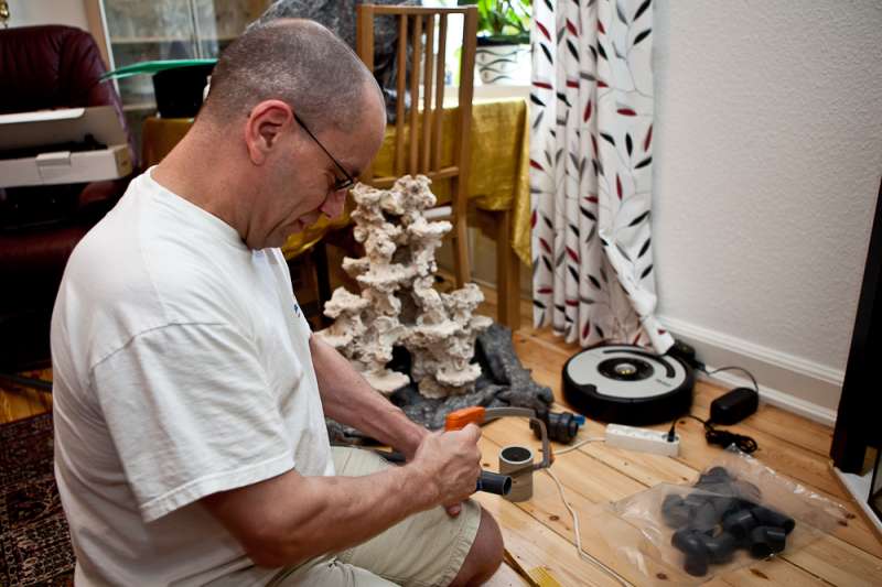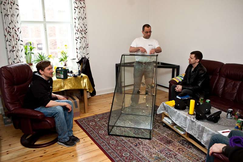 Så står det nye akvarium i vores lille stue på Østerbro. Takket være fire gode saltvandsvenner kom det ind i lejligheden. Jeg tror, at hvis baljen bare var een centimeter større fra forruden til hjørnet, så havde det nok stået nede hos carsten igen. Det fremgår med al tydelighed på billederne, at det ikke var en helt let sag. Baljen blev vendt og drejet adskillige gange før det stod i stuen,