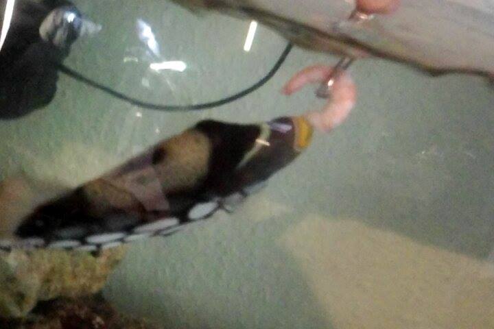 Herefter kom Joe i baljen, og allerede med det samme, kunne vi se, at hans vejrtrækning blev mere rolig, og han fik farven tilbage. Han svømmede straks ind i hulen, hvor han trykkede sig mod bagvæggen.