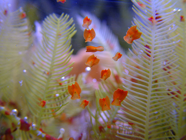 Det er igen lidt ligesom med koraller, alt efter om der er tale om seksuel reproduktion eller aseksuel reproduktion, kan der være forskel på om "larven/ægget/fragmentet/segmentet" allerede indeholder sin symbiosealge når den/det bliver til... Hvis ikke, er det altafgørende at denne så samles op fra vandet hurtigst muligt, for at sikre overlevelsen i denne kritiske fase, og dermed kunne nære sig via lyset.