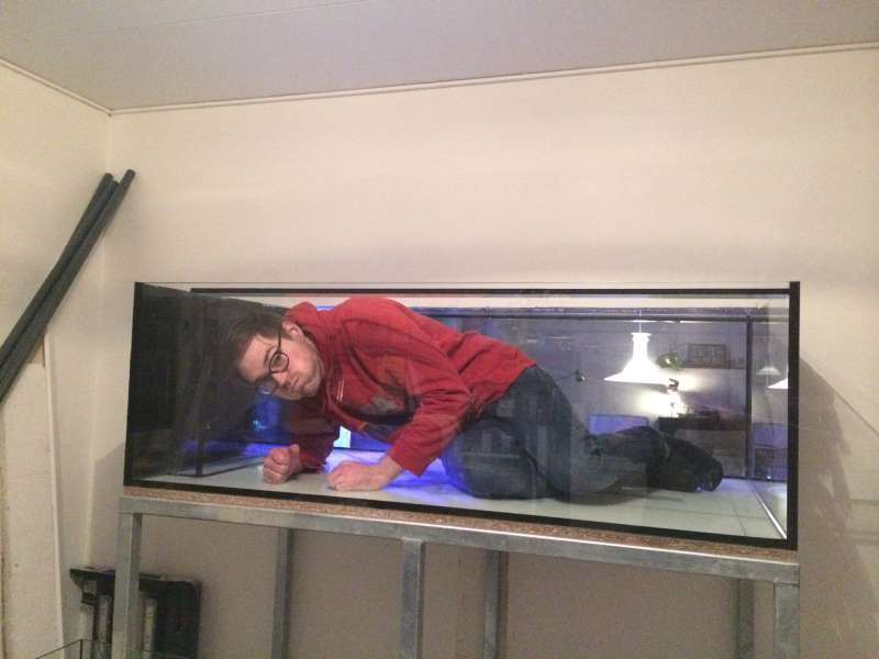 150 cm langt, 90 cm dybt og 50 cm højde, 1/3 af kontoret, nøj det bliver fedt! Akvariet lige landet. Front og bag glas er med opti-white