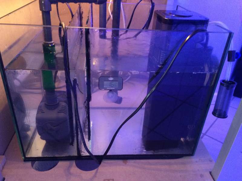 Så er der kommet vand i baljen... 2 gange! De døde sten var så fulde af guf at vandet fik en ret kraftig lugt og grønlig farve derudover gik skummeren amok så den måtte hæves 15 cm for ikke at skumme alt for meget over. Derfor røg alt vandet ud igen og der er idag kommet nyt på, fingers x'ed