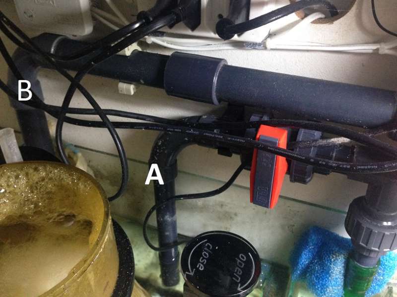 Jeg har vedhæftet billede af mine rør. A kommer fra returpumpen, B kommer er overløbsrør fra akvarie.