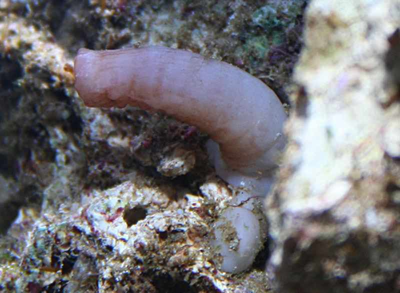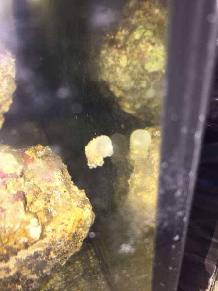 Det er det samme dyr der er på begge billeder, inden den kom tilbage i baljen kom den i et glas mens det blev afgjort om den var god eller "ond". I glasset satte den sig fast på bunden og foldede en lille vifte ud (ala dem små rørorm har, bare mere fast i strukturen) den har ingen hårde dele og minder mere om en lille anemone end en snegl. Nu er den ikke at se i akvariet, så jeg kan ikke opdatere med flere billeder desværre.