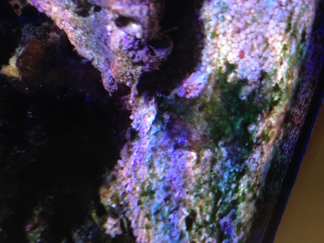 Algerne er grønne, slimede og kan relativt nemt fjernes, men på 1 uge kan de dække hele bundlaget igen. Der kommer ikke rigtig noget på de levende sten.