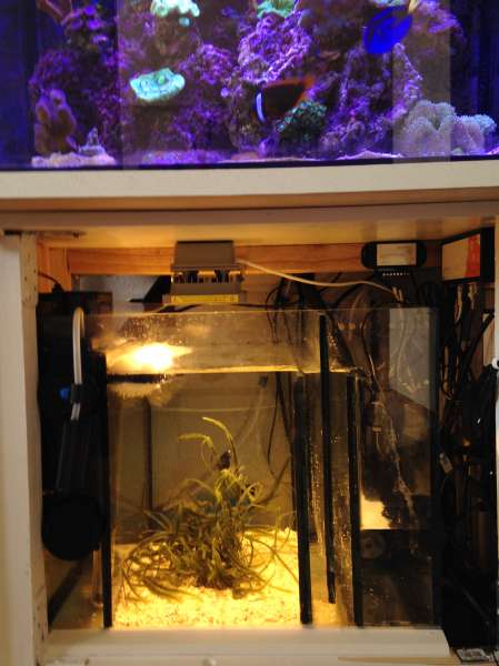 I foregårs da jeg var inde i Køge og arbejde lidt og var tidligt færdig tænkte jeg at jeg ville kører forbi minizoo, bare fordi det var længe siden. Derinde fik jeg købt mig lidt Caulerpa taxifolia som også var planen til at starte med. Jeg ville godt nok have ventet, men efter alle de test's jeg har lavet med min sump og overløb, følte jeg mig sikker nok på det ville holde.Og allerede har jeg set nu min Ph er steget fra 7,8 til 8,0 som det laveste, så det er positivt. Det eneste jeg faktisk mangler i sumpen pt, er en float switch i retur kammeret til at sige hvis vandet bliver for lavt grundet stoppet returrør, eller alger der sidder fast. Så returpumpen stopper og jeg får en email/SMS. Har switch, er bare doven :)