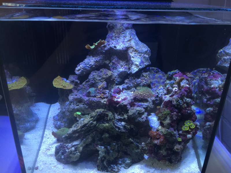 Ca 8,5 kg ægte sten er prasset ned i den lille tank og 1,6 kg lega hav farm sten er der også brugt (zoa have).