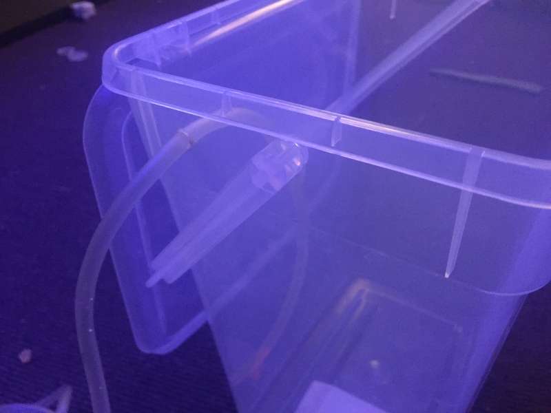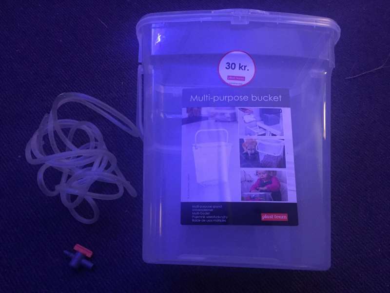 Først bores der et hul til vand ind i den ene side af spanden. Dette er hullet hvor vandet fra dit akvarie drypper ind.