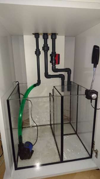Jeg har 3 kamre i min sump og det ene er fyldt op med levende sten. Ellers har jeg skummer, varmelegeme i kammer 1 og returpumpe og fosfat filter i kammer 3.