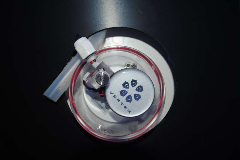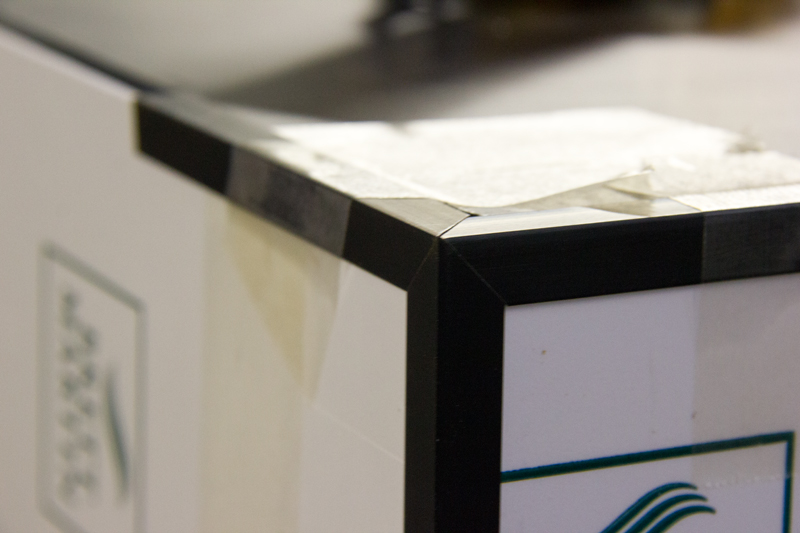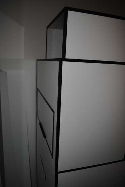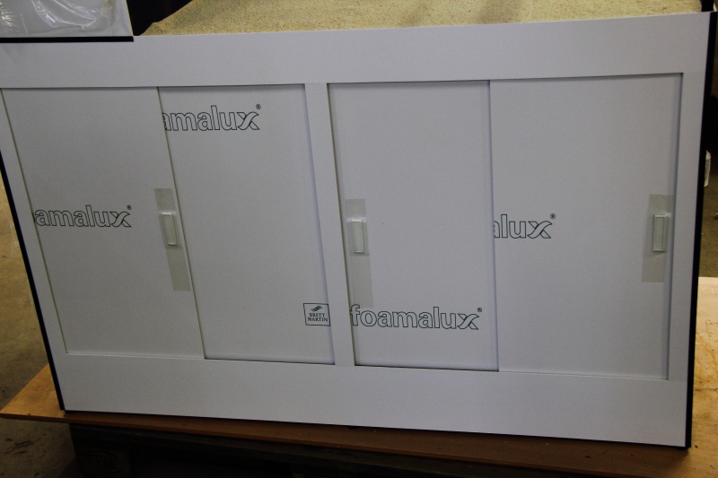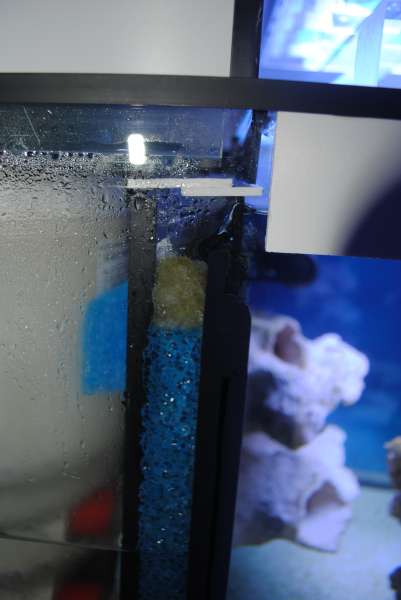 Jeg tegnede en "skummertop", da min BK 180 Mini plus min Vertex Vectra Engine er højere end akvariet. Jeg har fået det lavet sådan, at hvis akvariet stod som en rumdeler, så er de to sider på skummertoppen som ses fra langsiden hvide, så det passer til resten af systemet. De to andre sider er i klar akryl, så jeg kan se ind og holde øje med overløbsboksen, eller hvornår skummerkoppen skal tømmes. Set fra oven er toppen sort, så den passer til den sorte dæk-plade i foamalux, som dækker resten af sumpen, og holder fugten inde. Det kan bestemt ses på luftfugtigheden i rummet, at hele akvariet og sumpen er +95% lukket. Jeg målte op, og borede et hul, så det passer med, at Vertex Vectra Engine og silikoneslangen, til luftindtaget på skummeren, lige stikker ud. "Skummertoppen" kan selvfølgelig tages helt væk, når jeg skal have skummeren op. Da jeg har lavet min DIY-lampestander lidt højere, så falder lyset fra lampen ind i skummertoppen, og giver derved chance for alger deri, og det ønsker jeg ikke. Så den side ud mod lampen har jeg blændet af med hvid folie. Efter at jeg hævede min ATI lampe, så kom der for meget lys ud i rummet, og jeg lavede en afskærmning, formet som et stort L og afstivet med en aluminiumsliste på hver side, ud af hvid foamalux og sorte kantlister.