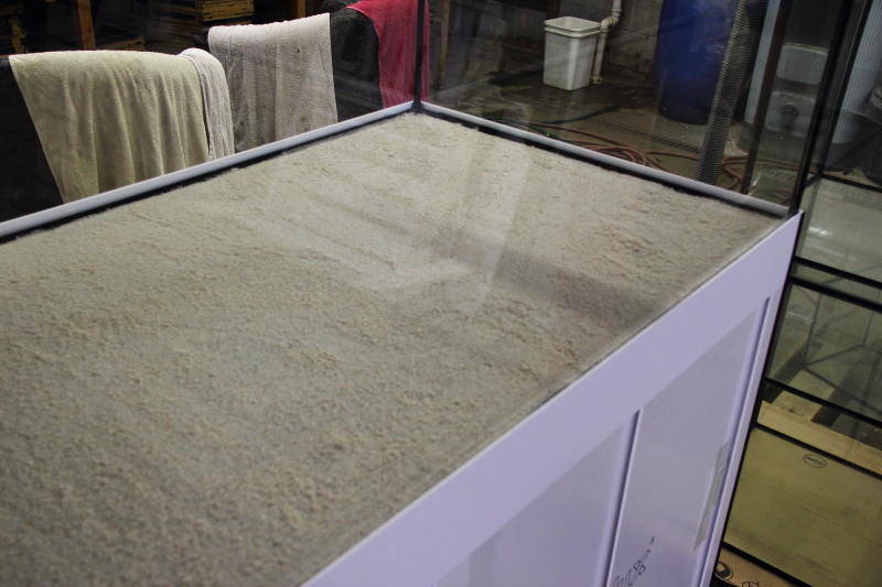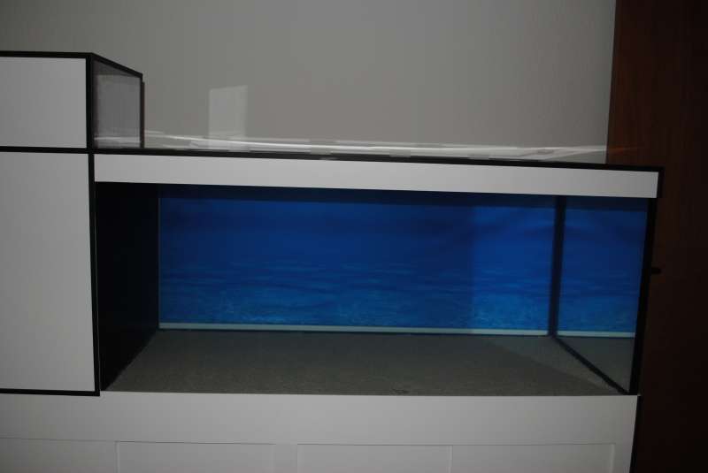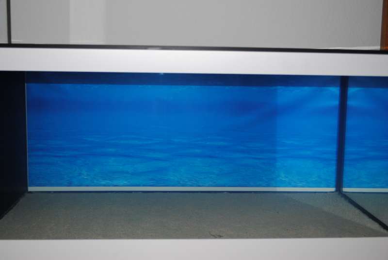 Som baggrund bruger jeg en akvariebaggrund fra Juwel, der er tapet fast på en klar akrylplade, som er et foto af shallow water, hvor man kan se havoverfladen og sandbunden, og den passer perfekt til et shallow reef akvarie. Akvariet er ved at blive fyldt op med osmosevand.