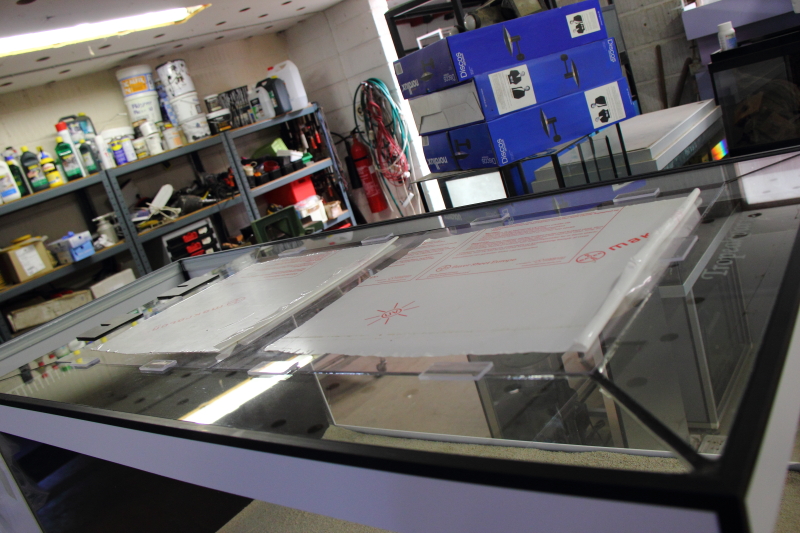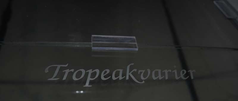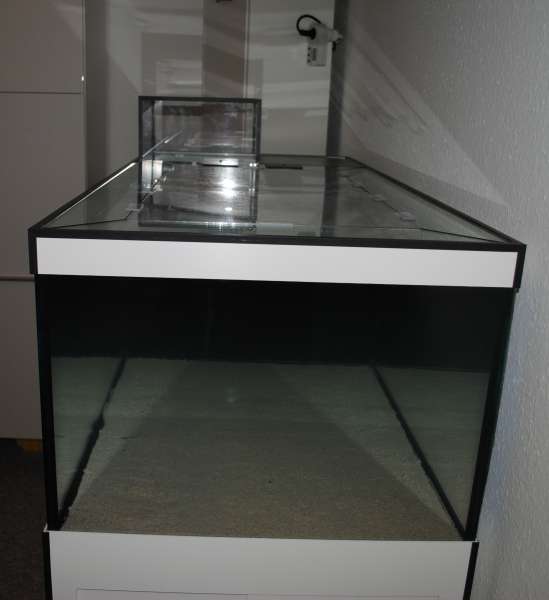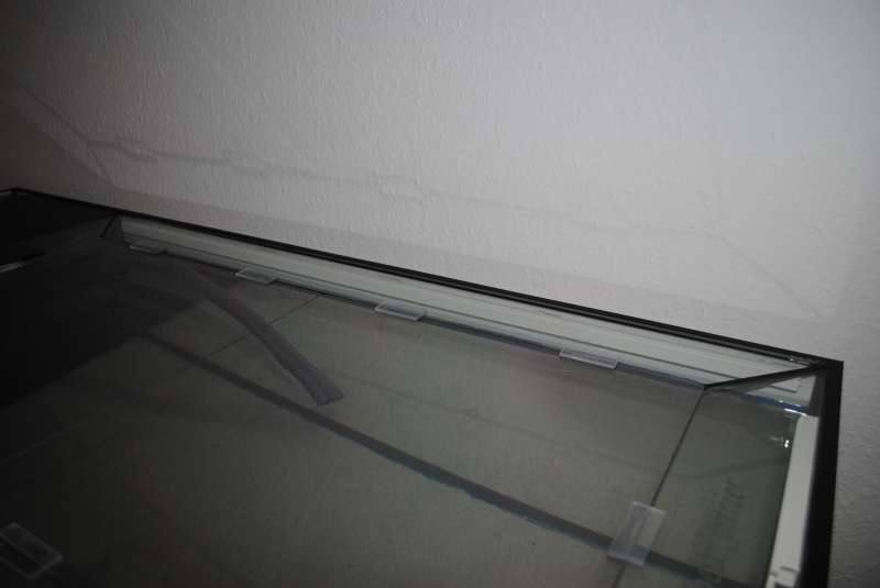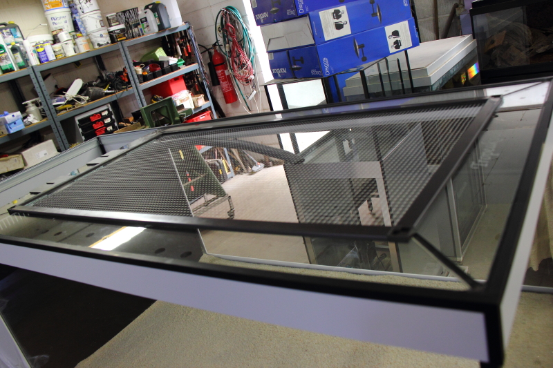 Front-, bag- og højre siderude er med optic white glas, så jeg har mulighed for at lave det om til en rumdeler. Akvariet er nu placeret op af væggen med den indvendige sump i venstre side, hvor jeg kan kigge ind i akvariet fra fronten og højre side. Det er også derfor, at bordet er lavet sådan, at der er låger på hver langside og i højre side. Der er monteret udluftningsriste i lågerne på højre side, og der er lavet tre huller i venstre side til ledninger og rørføring. Alle låger er afstivet med en aluminiumsliste. Så bordet er klar til en udvendig sump engang