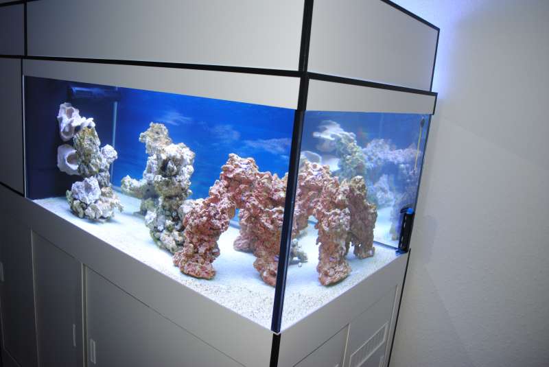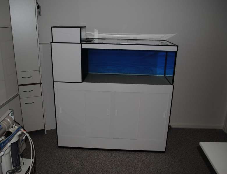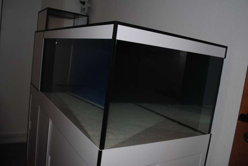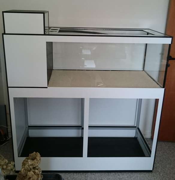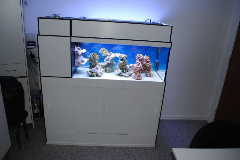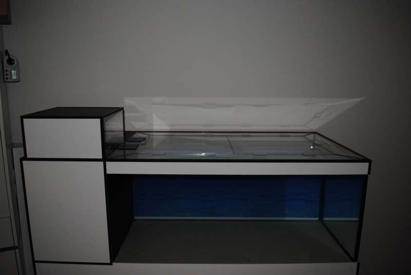 Jeg har selv designet og tegnet akvariet angående indretning, udseende og flere småting. Det er lavet af Claus fra Tropeakvarier, og har målene L130 x D60 x H45 med indvendig sump indrettet som en udvendig. Dog er vandstanden fast på 40 cm, da jeg elsker shallow reef akvarier, og de sidste cm tilovers er med vilje, så der er plads til lidt bølger i akvariet. Det er også en af grundene til, at der er en 9 cm bred bølgebryder hele vejen rundt kontra mit forrige, hvor det ikke kunne lade sig gøre pga. den indvendige sump, som var placeret i midten. Ved det gamle oplevede jeg, at der ikke skulle meget til at lave lidt bølger med risiko for, at det kunne skulpe over. Der er boret to huller i bølgebryderen ind mod sumpen, hvor det ene er til ledninger fra akvariet, og det andet er til min fodercylinder og foderautomat. Der er lavet 2 låg til hullerne, hvor der er lavet en rille i til ledninger. Til om vinteren har jeg fået skåret to stk. akrylplader, hvor der er limet fem små "holdere" på hver plade, så det ser ud, som om at dækglasset "svæver i luften" og flugter med bølgebryderne. Det giver et mere stilrent udseende. Til om sommeren har jeg købt et tank cover, som består af en aluminiumsramme med et finmasket net, så fisk ikke kan springe ud. Jeg er træt af, at miste fisk på den måde
