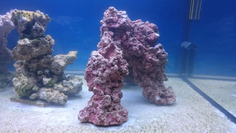 Dekorationen består af 3 stk. Atoll nano-søjler, 1 stk. JJ reef-cave og 1 stk. JJ nano-søjle. JJ nano-søjlen har jeg delt og limet den ene del på en af Atoll-søjlerne, så den danner en bro med en af de andre nano-søjler, hvis de bliver rykket sammen. På skillevæggen ind til sumpen "svæver" 2 stk. Magnetic Reef Shelfs fra The alternative Reef.