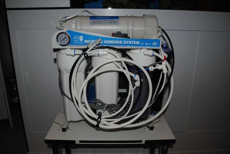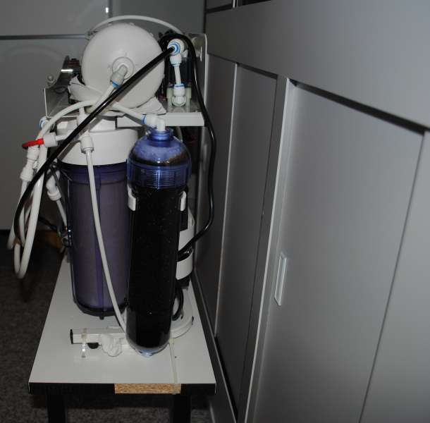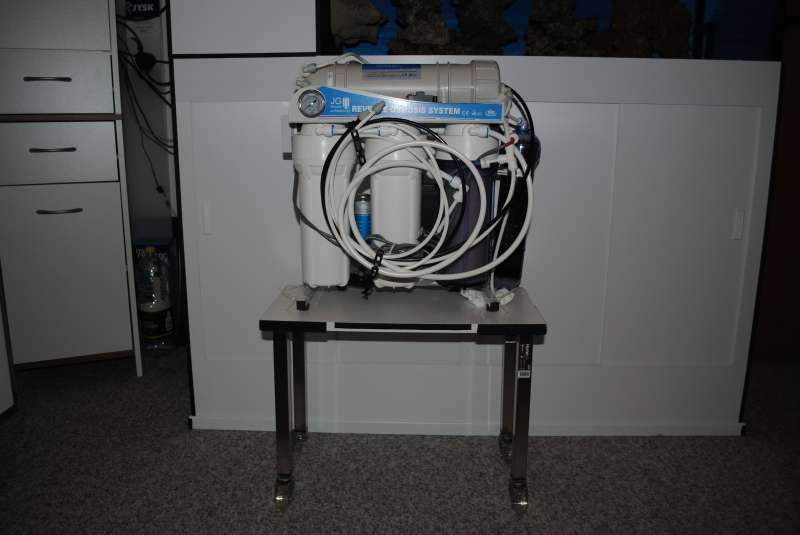 Jeg har et Sirius 500GD osmoseanlæg, hvor jeg har sat et ½ liters fyldbar harpiksfilter fast på stellet med et 2,5" clip vægbeslag. Harpiksfilteret hænger lodret, da det er bedst pga. flowet igennem filteret. Før og efter harpiksfilteret har jeg monteret en DM-2EC dobbelt µS monitor. Osmoseanlægget er stripset fast på et lille DIY-bord med fire ben og hjul på, så jeg kan rulle det ud i køkkenet, når der skal laves vand.