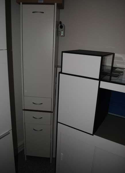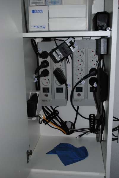 Til lidt opbevaring og som "teknikskab" har jeg købt et badeværelsesskab og boret to huller og limet to kabelgennemføringer i. Billede af dette ses længere nede.