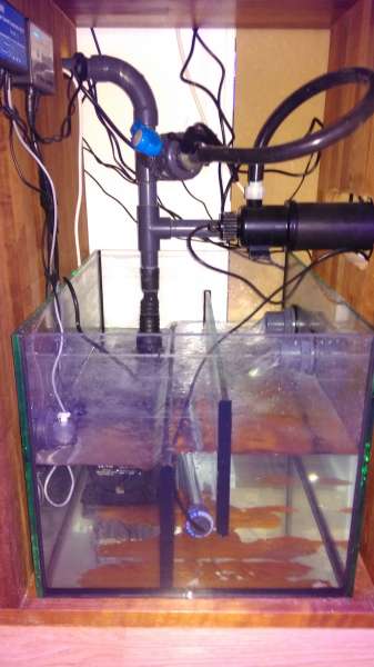 fisk. Mit sidder lige efter returpumpen således at alt vand kører gennem UV og op i akvariet.