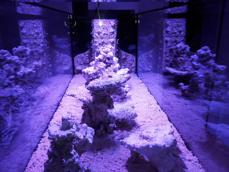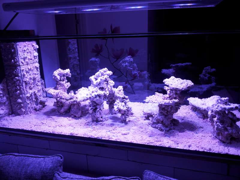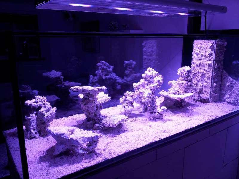 Jeg har valgt en meget luftig dekoration med 3 søjler fra Atoll og lidt andet hjemmelavet søjle-halløj. De Atoll-søjler er super fede, synes jeg, og så er der masser af muligheder til at sætte de forskellige stenkoraller rundt omkring. Jeg købte i samme omgang nogle kg døde LS, så jeg kunne lave en søjle mere og et enkelt platau også. Selve bagvæggen af baljen, ind mod muren med overløbet, har jeg også dekoreret. Tog nogle plexiglasplader, og skar dem til. Knuste nogle LS, og limede det med PU-skum. Det har fungeret rigtig godt, synes jeg, og det er i dag ved at være godt indgroet i forskellige plade-koraller. Jeg har ca. 1 cm koralgrus som bundlag, men det er for tiden ikke så ligeligt fordelt. Det er pga. jeg gerne vil begrænse antallet af cirkulationspumper. Derfor kører de nuværende rimelig hårdt på, da mine koraller godt kan lide dette. Så sandet bliver skubbet lidt rundt.
