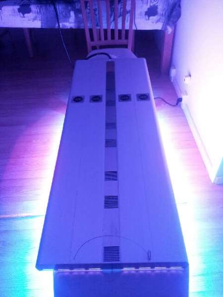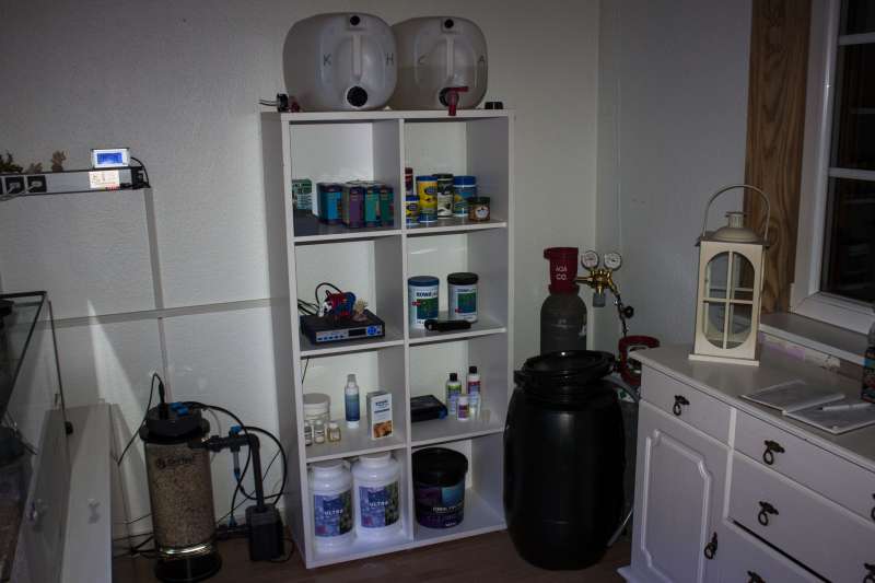Sumpen har jeg stående oppe på et hjemmelavet bord, som ca. er 65 cm højt. Bordet er beklædt med hvide højglanslåger, så det er pænt og stilrent i mit teknikrum. Sumpen måler L150 x D45 x H45 cm, og er forbundet til displaytanken i stuen via rør og slanger gennem væggen. Det at have sumpen oppe i højden er simpelthen så dejligt ift. rengøring osv. Alt bliver bare nemmere, når det er i god arbejdshøjde. Sumpen er opdelt i 3 rum. Det første hvor nedløbet er, måler ca. 60 x 45 cm, og huser en DSB og fragmentområde. Det oplyses af en GHL Mitras HV, så jeg har gode forhold og masser af lys til mine SPS-fragmenter. Dernæst kommer en boblefælde, som er lavet, så jeg kan sætte et stykke filter deri, hvis jeg har brug for at fjerne svæv fra vandet. Efter boblefælden kommer skummerrummet, hvor der også er 2 stk. 300 W Eheim varmelegemer. Returkammeret måler 20 x 45 cm og huser selvfølgelig returpumpen, og så har jeg min Deltec reactor stående der også.
