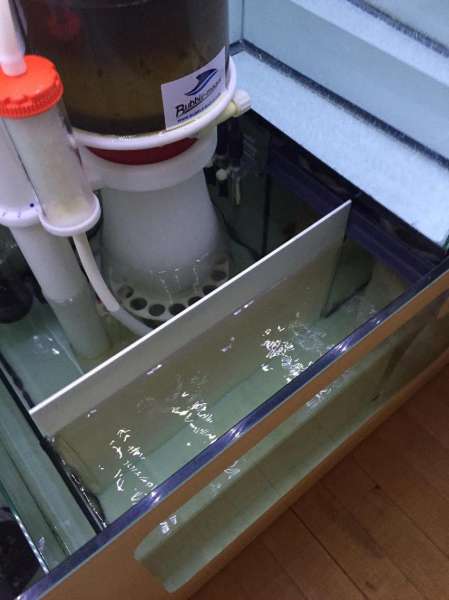 Det går iøvrigt helt fantastisk med denne løsning til refugium. Vandgennemstrømningen er helt automatisk en del mindre end den er i det første kammer, så længe jeg bare husker at skifte filtersokken i første ''kammer'' inden den stopper til og vanden bare løber over :)