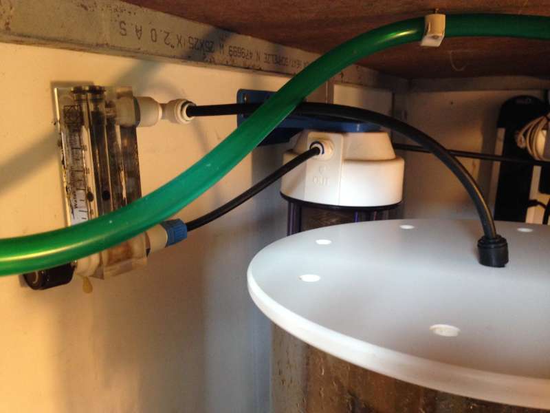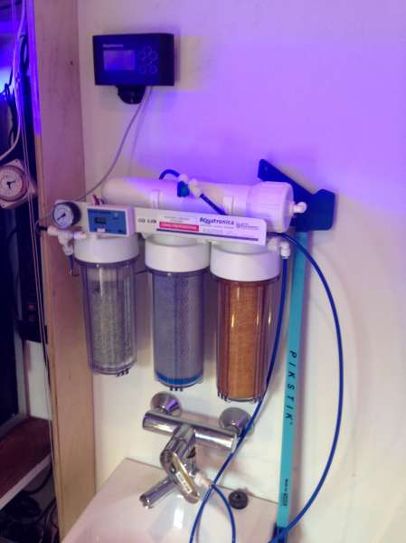 Selvom hanevandet i Gilleleje er relativt rent (ca. 200 ppm kan jeg måle på indgangen til osmoseanlægget), renser jeg stadig vand til påfyldning og vandskift med et osmoseanlæg, som er et Aquatronica Osmopure 75 GPD. Jeg har skiftet membranen 1 gang og de billigere filtrer samt harpiks efter behov.