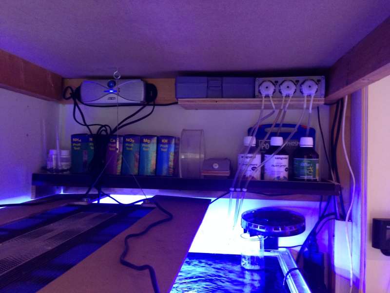 En Tunze osmolator sørger for påfyldning af RO-vand fra et kammer i sumpen. Jeg har brændt et par pumper af fordi, at jeg glemte at brygge vand. Det hjælper et par vandniveaufølere mig nu med at huske. De er sluttet til Aquatronica-computeren, og giver lyd, hvis vandstanden bliver for lav.