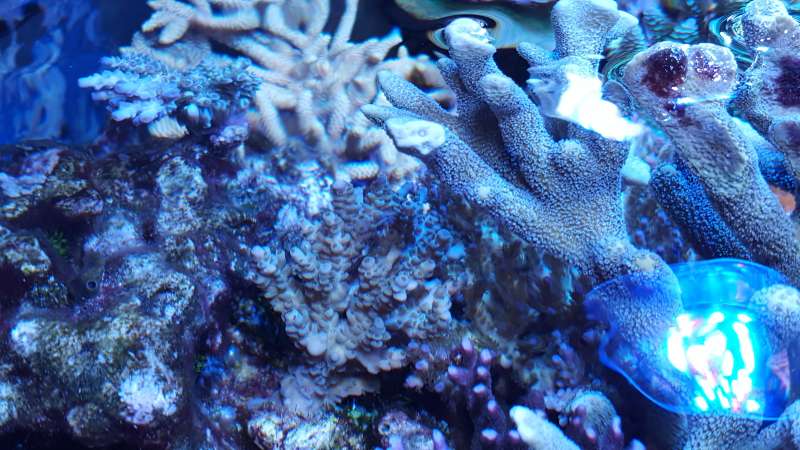 Min er begyndt at blive smuk blå, kraftigst farvet der hvor den får fuldt lys. Den står omgivet af M.digitata og M.gaimardi og har derfor områder hvor lyset er lidt diffust og det giver tydelige forskelle i intensitet. Reeffarmers navinii er lysere i farven end min, men det er ikke unormalt. De skriver på Reeffarmers side, at den blå farve bliver kraftigere i ”fangenskab” og det passer med mine observationer. (se eksempel længere nede i indlægget)